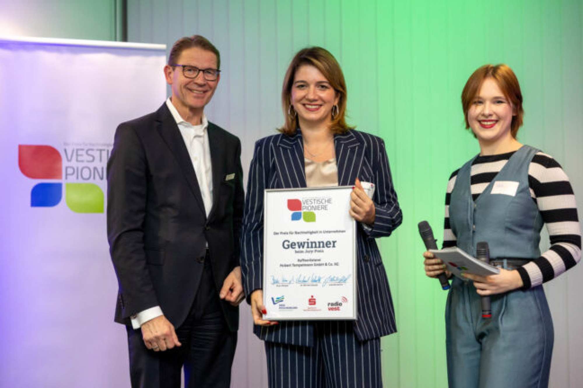 Ähnlich begeistert wie die Jury-Mitglieder waren auch die Laudatoren des Abends – Martina Eißing, stellvertretende Landrätin des Kreises Recklinghausen, Dr. Michael Schulte, Vorstandsvorsitzender der Sparkasse Vest Recklinghausen, Julia Winterfeld, Chefredakteurin bei Radio Vest, und Prof. Dr. André Latour von der Westfälischen Hochschule, der den Publikumspreis überreichte. Sie hoben hervor, wie wichtig nachhaltiges Handeln ist und lobten die Innovationskraft der ausgezeichneten Unternehmen.
