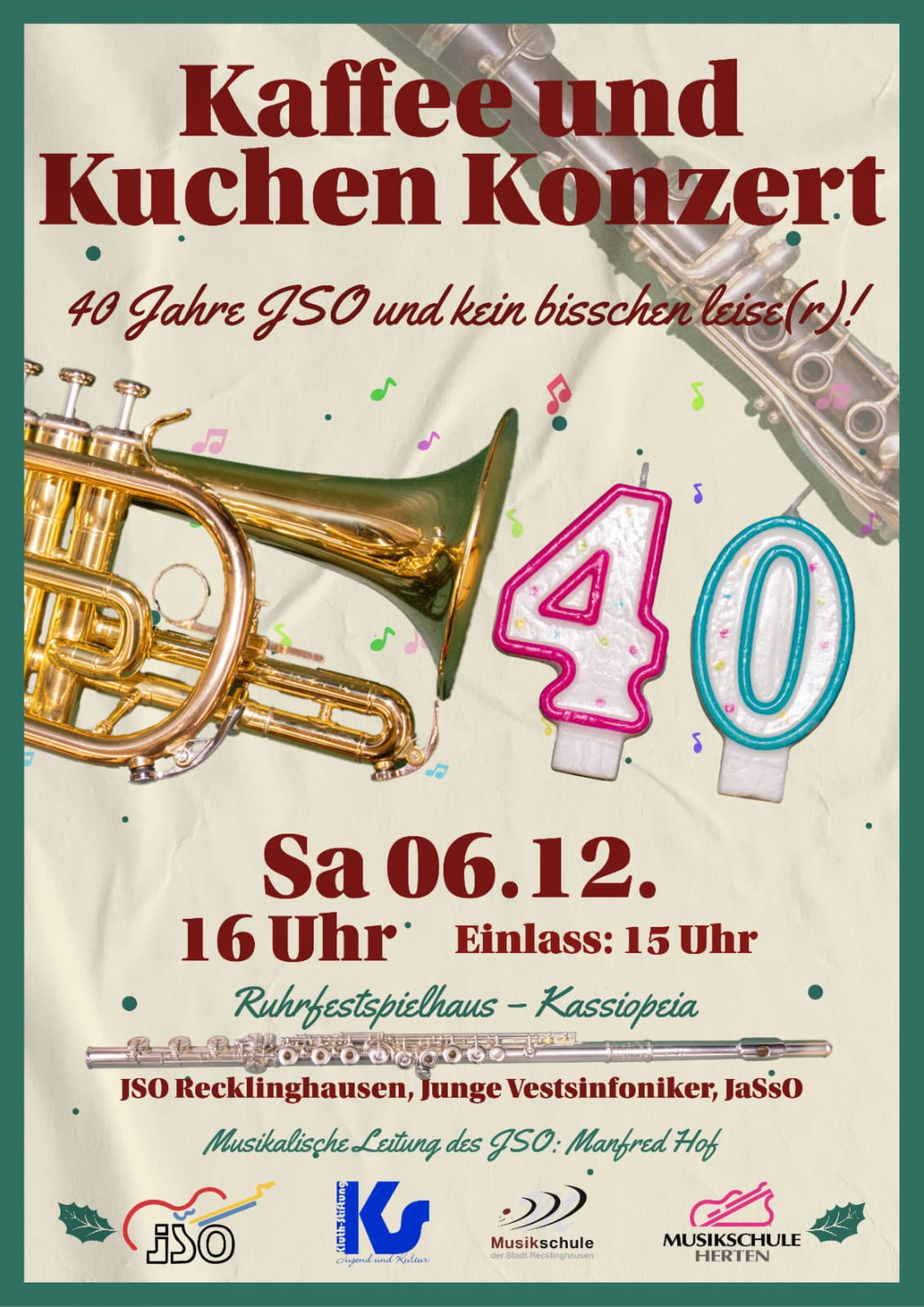 Das Jugendsinfonieorchester Recklinghausen (JSO) lädt in diesem Jahr zu einem ganz besonderen Kaffee- und Kuchenkonzert ein: Unter dem Motto „40 Jahre JSO – und kein bisschen leise(r)“ feiert das Ensemble sein rundes Jubiläum mit einem abwechslungsreichen musikalischen Programm.